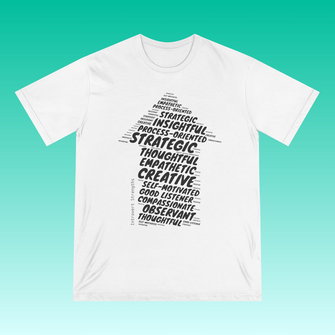 My designs feature messages or reminders that introverts might often want to share, but feel better allowing the tee to "share" them instead.