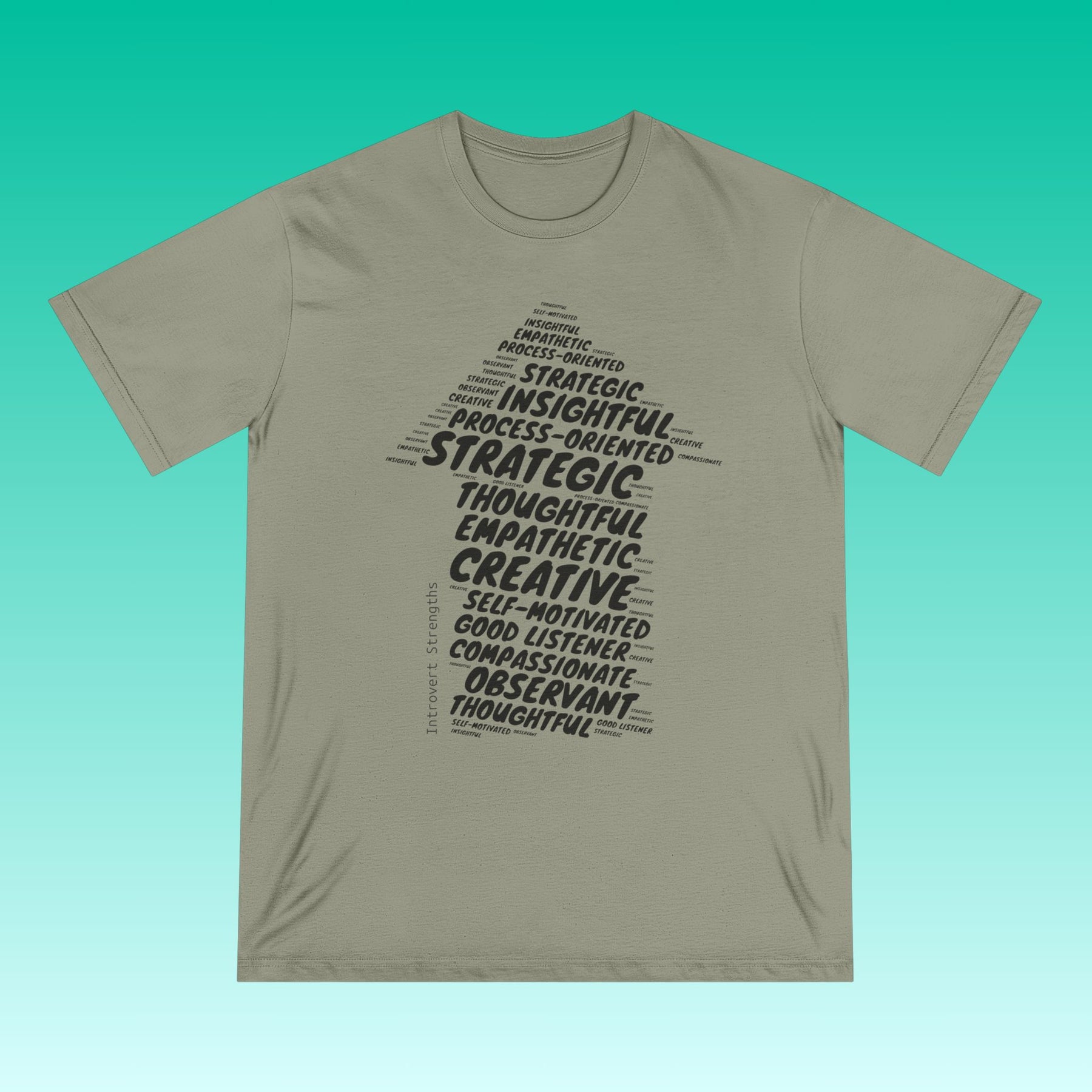 Make people aware of your inner power with this comfortable and eco-friendly organic men/unisex t-shirt. It features a word cloud of introvert strengths artfully arranged in an upward-pointing arrow, symbolizing growth and potential.