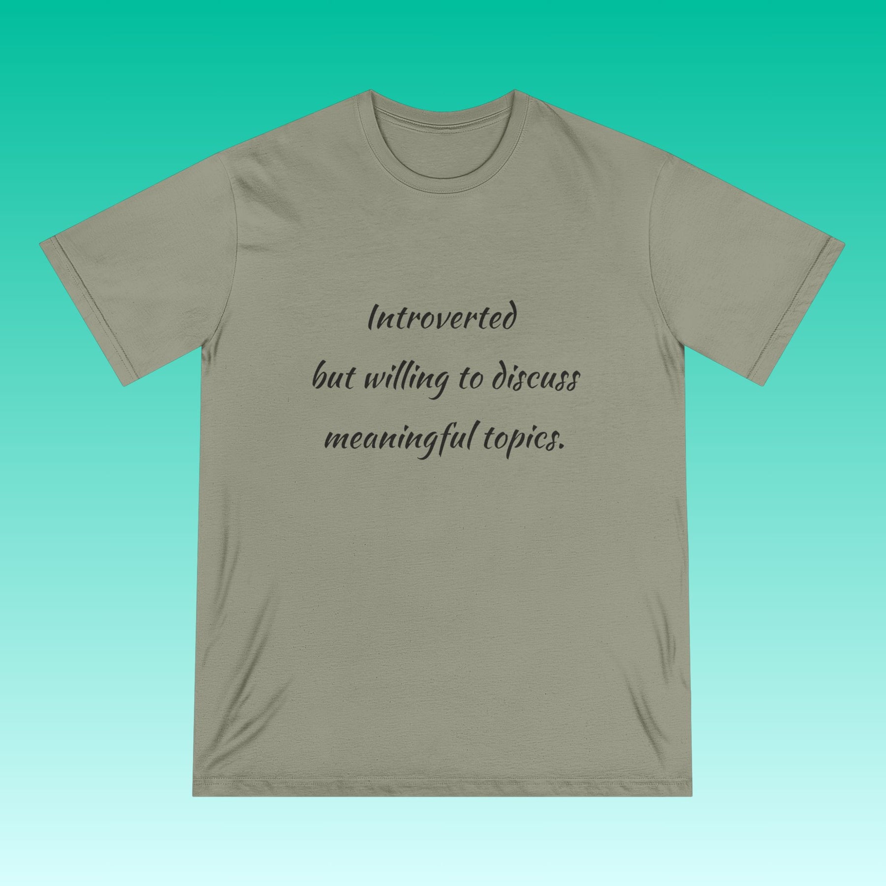 Available in classic White and earthy Eucalyptus with a contrasting black text print, this tee features the straightforward message: Introverted but willing to discuss meaningful topics.