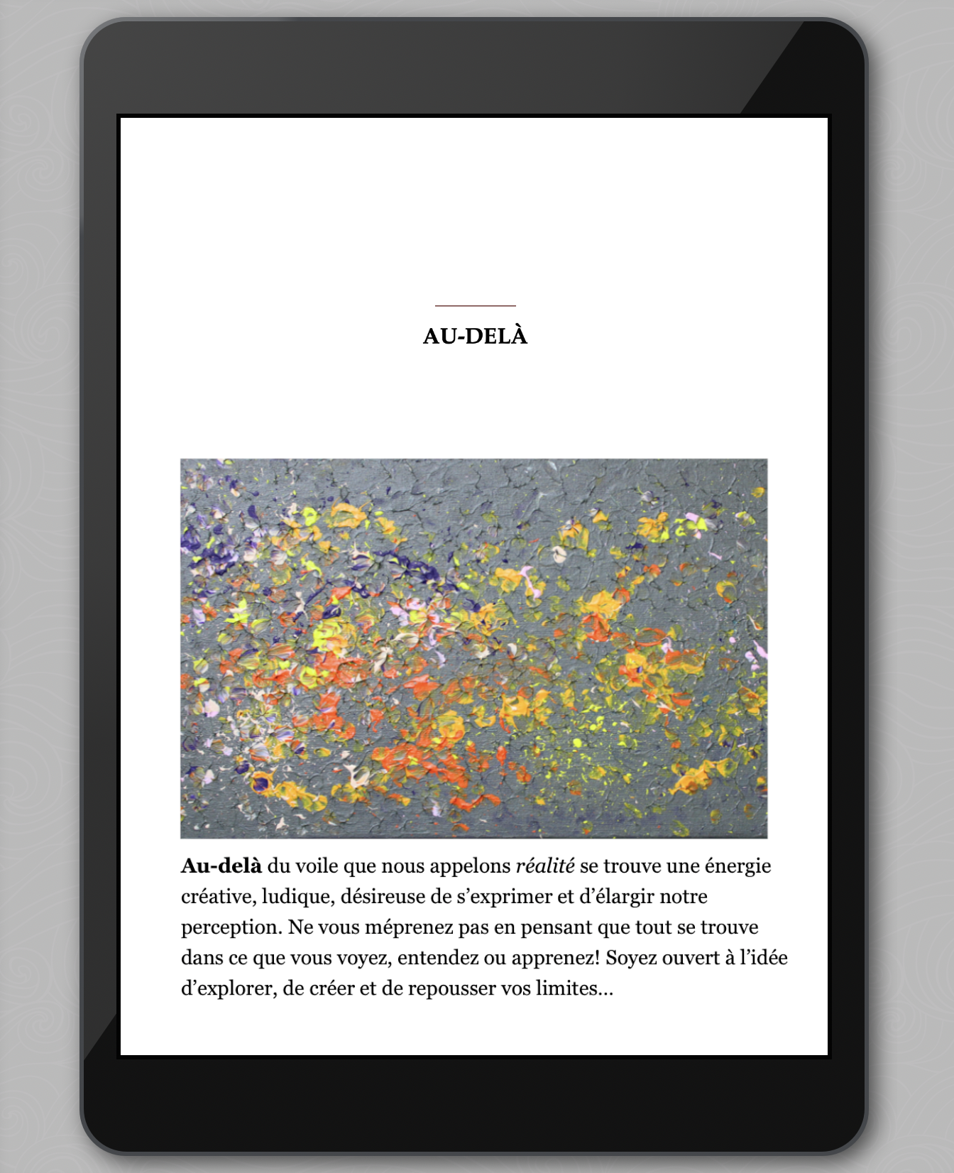 J'avais lu le premier livre (non-fiction) de Gabriela mais je ne savais vraiment pas à quoi m'attendre de son travail artistique. J'ai abordé ce livre avec curiosité et un peu d'appréhension. Eh bien, je n'aurais pas dû m'inquiéter. À partir du moment où les images ont illuminé mon écran, j’ai été époustouflé par la beauté et la puissance des couleurs et des peintures, ainsi que par les émotions et les énergies qu’elles évoquaient en moi. Chaque peinture est accompagnée d'un extrait de sagesse que vous pouvez utiliser (ou non) comme passerelle vers votre expérience avec la peinture ou comme outil de méditation. Ce livre m'a donné envie d'essayer de peindre moi-même, de voir ce qui pourrait émerger à travers ce canal créatif. J'ai l'intention de revoir ce livre plusieurs fois pour inspirer, détendre, stimuler et réfléchir.