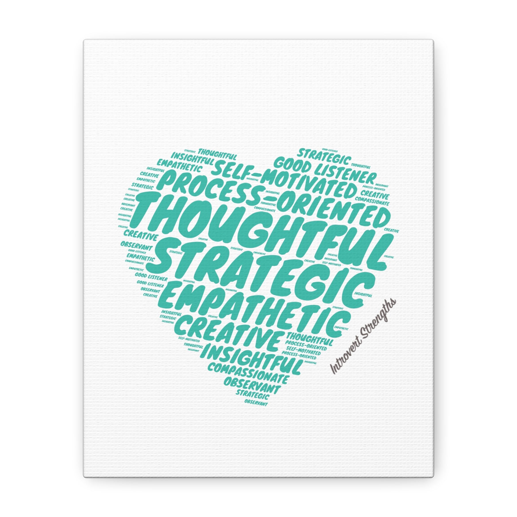 Enhance your personal space with this unique design and calming teal color canvas featuring a heart-shaped word cloud that highlights key introvert strengths such as "Strategic," "Creative," "Thoughtful," and "Empathetic."