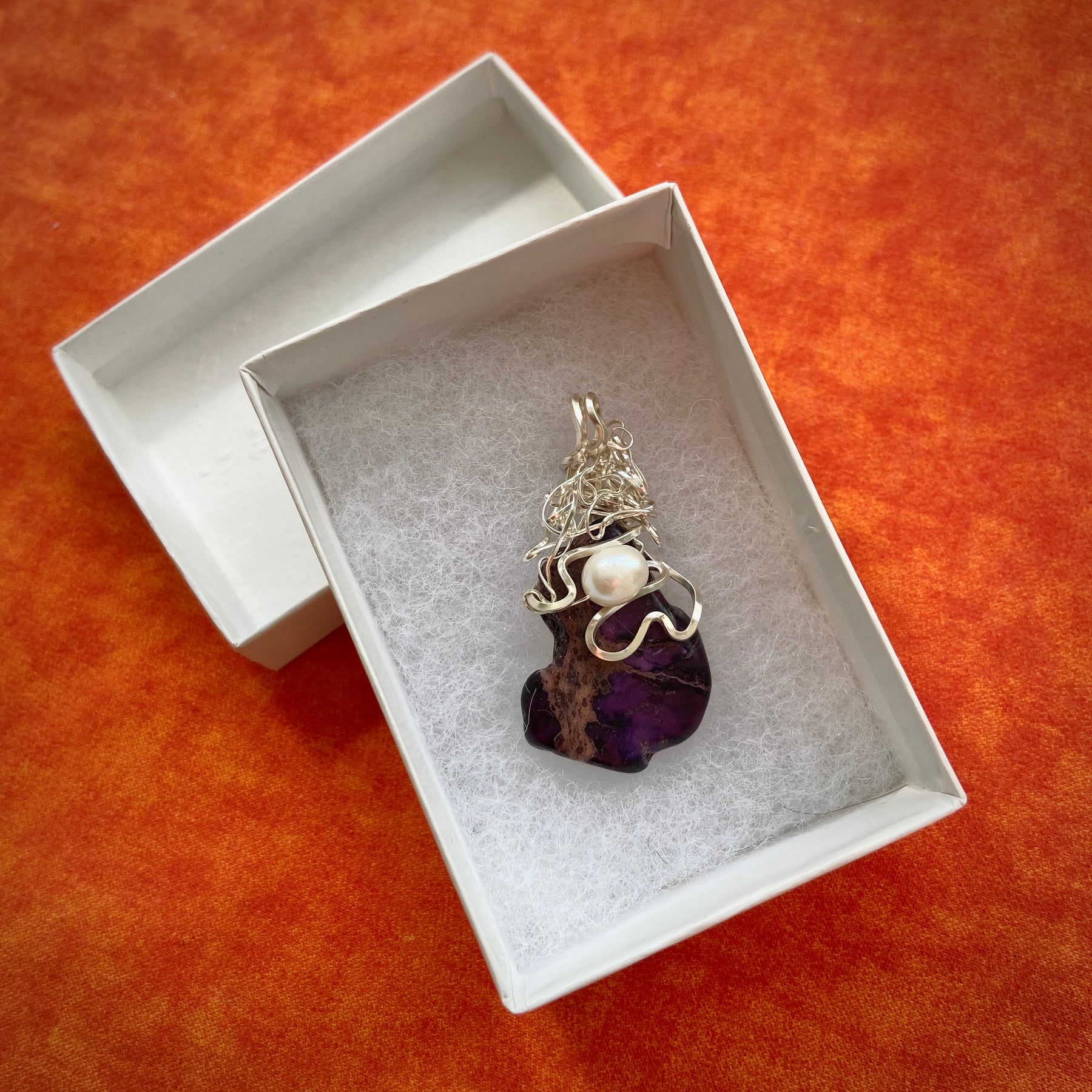This one-of-a-kind pendant features a raw Purple Jasper semi-precious stone and a delicate pearl accent, hand-wrapped in silver-plated wire. I designed this piece to be more than just jewelry: a gentle "grounding tool" that helps you feel calm and connected with your true self.