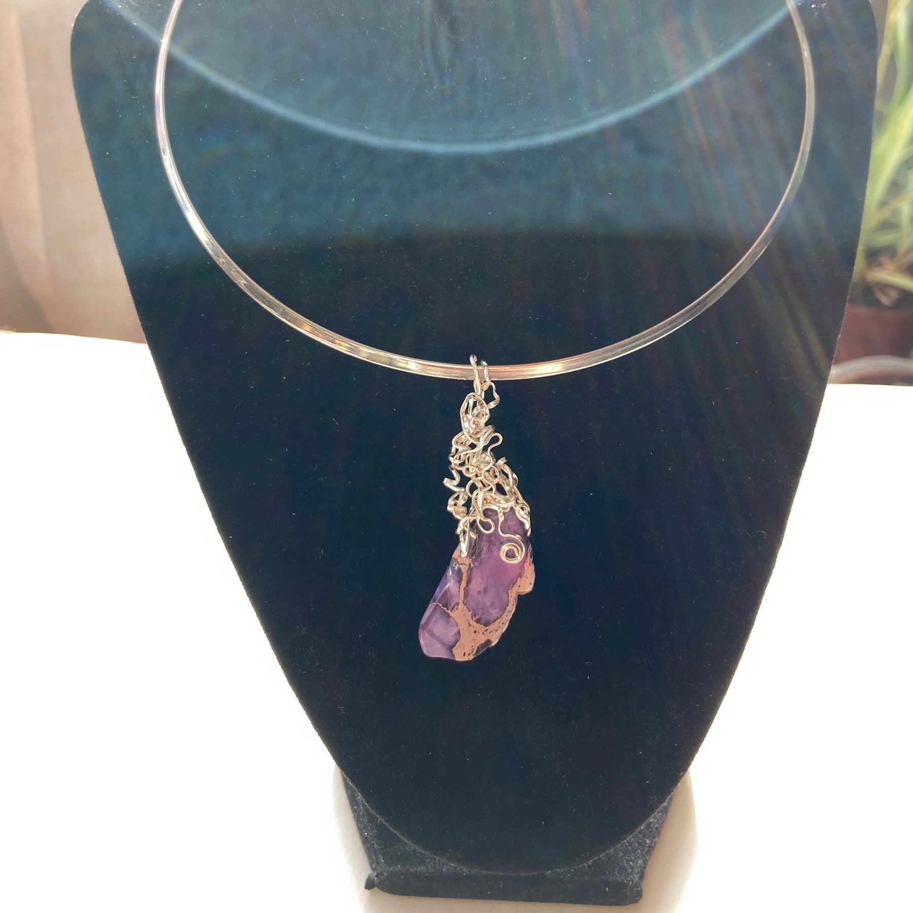 This one-of-a-kind pendant features a raw Purple Jasper semi-precious stone hand-wrapped in silver-plated wire with an artistic, flowing design. I crafted this piece to be more than just jewelry: a gentle "grounding tool" that helps you feel calm and connected with your true self.